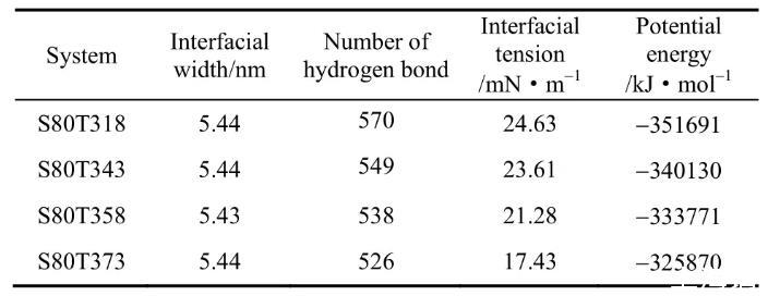 表2通過界面張力、表面活性劑與水的氫鍵數(shù)量、勢能3組數(shù)據(jù)對比得出表面活性劑的界面張力隨著溫度升高而降低的結(jié)論。數(shù)據(jù)表明在4組模擬實驗過程中,界面的寬度并沒有發(fā)生改變。因此界面張力下降的主要原因是由于OPES勢能的降低導(dǎo)致分子之間的作用力也隨之降低。