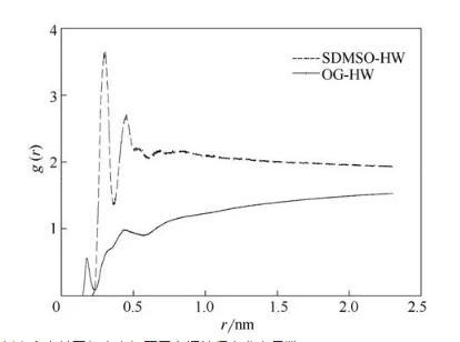 在OPES結(jié)構(gòu)中,有兩個親水基團分別為氧乙烯基(OG)、磺酸基(SDMSO),本文通過徑向分布函數(shù)(通常指的是給定某個粒子的坐標(biāo),其他粒子在空間的分布概率)來對比兩者與水之間的作用力。圖5為表面活性劑中氧乙烯基和磺酸基與水分子中氫原子的徑向分布函數(shù)、。由圖可知,(r)曲線第1個峰值出現(xiàn)在0.306處,這表明磺酸基中的氧原子與水g中的氫原子之間較強的氫鍵作用形成了第1水層;在距離為0.458時,出現(xiàn)第2個峰值,數(shù)值有所下降,這表示逐漸減小的氫鍵作用形成了第2水層;第3水層形成在0.688處,此時磺酸基與水的作用進一步減弱,但3處的峰值均遠大于氧乙烯基的峰值。這表明磺酸基與水分子的作用力遠高于氧乙烯基,所以磺酸基為辛基酚聚氧乙烯醚磺酸鹽結(jié)構(gòu)中的主要親水基團。