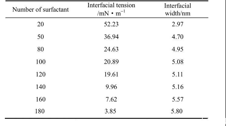 從表1可以發(fā)現(xiàn)表面活性劑數(shù)量的增加使得界面張力逐漸下降。其中當(dāng)OPES數(shù)量由20增加到80時,界面張力值較高,這說明當(dāng)表面活性劑濃度較低時并不能起到很好的降低界面張力的作用;隨著表面活性劑數(shù)量進一步增加界面張力逐漸下降,當(dāng)OPES數(shù)量為180時,達到臨界飽和狀態(tài),此時界面張力僅為3.85 mN·m-1,此變化規(guī)律與真實實驗規(guī)律相同。這同時也說明辛基酚聚氧乙烯醚磺酸鹽可以很好地降低界面張力,是一種性能優(yōu)良的表面活性劑。界面寬度用體系密度圖中表面活性劑的密度曲線寬度來表示。隨著表面活性劑個數(shù)增加界面寬度遞增,起初界面寬度增加速度較快是因為界面OPES濃度過低并未飽和;當(dāng)OPES數(shù)量達到100~140時,界面寬度僅有少量緩慢增加這是由于此時界面正在逐漸接近飽和狀態(tài)。隨著OPES的數(shù)量達到160和180時,界面寬度增加幅度變大,進一步驗證此時界面已達到飽和狀態(tài)。