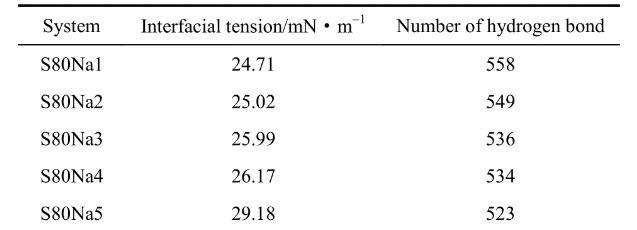 為進一步確定OPES的耐鹽性能,可以再通過不同體系平衡狀態(tài)時相應(yīng)的界面張力和氫鍵數(shù)量來討論,相關(guān)數(shù)據(jù)如表3所示。