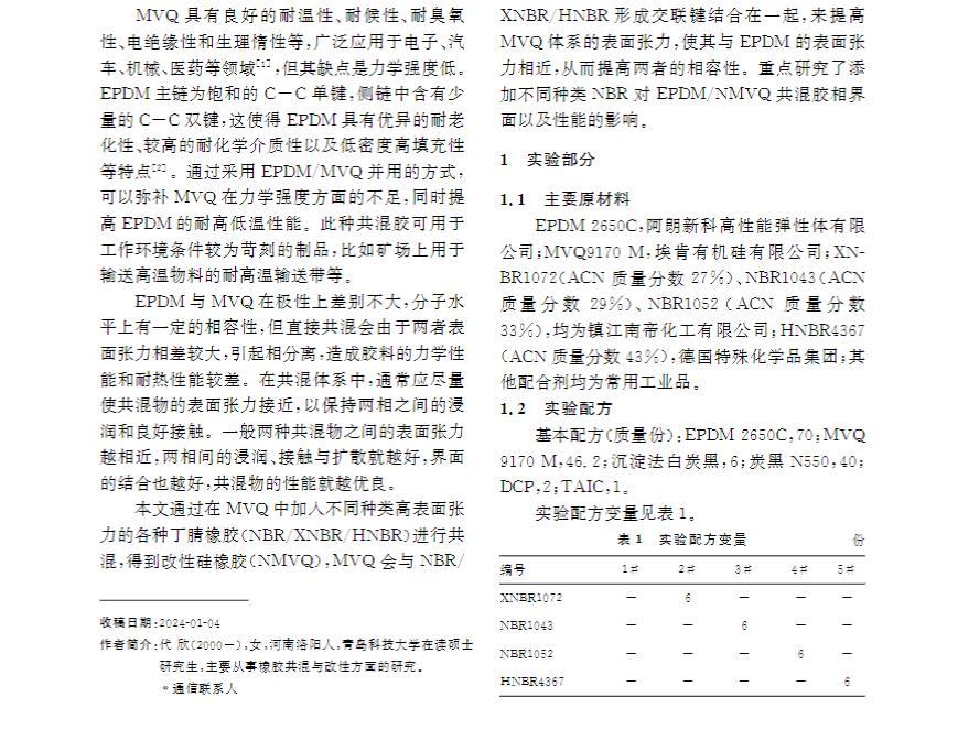 本文通過在MVQ中加入不同種類高表面張力的各種丁腈橡膠(NBR/XNBR/HNBR)進行共混,得到改性硅橡膠(NMVQ),MVQ會與NBR/XNBR/HNBR形成交聯鍵結合在一起,來提高MVQ體系的表面張力,使其與EPDM的表面張力相近,從而提高兩者的相容性。重點研究了添加不同種類NBR對EPDM/NMVQ共混膠相界面以及性能的影響。