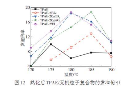 圖12展示了4種TPAE/無機粒子泡沫熟化后的發泡倍率隨溫度變化的情況。結果表明,相較于純TPAE,4種復合物泡沫的最終發泡倍率均有所增加,其中TPAE/CaCO3、TPAE/CaSiO3及TPAE/WI顯著提升。已知影響發泡倍率的主要因素有發泡劑的溶解度和聚合物的流變性能。由于無機粒子的添加量較少,基本不會影響CO2在復合物中的溶解度及流變性能。因此TPAE/無機粒子復合物的初始發泡倍率與純TPAE基本一致,但無機粒子的添加會促進TPAE形成開孔結構,尤其是CaCO3、CaSiO3以及WI可使TPAE形成高開孔率的泡沫,減小了泡沫的收縮,使得完全熟化后的發泡倍率遠高于TPAE,大大提高了TPAE的發泡性能。