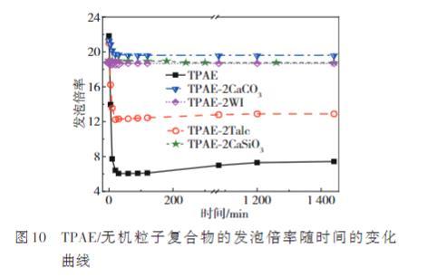 圖10 TPAE/無機粒子復合物的發泡倍率隨時間的變化曲線