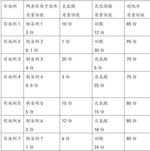 多晶硅蝕刻液實(shí)施例1-7包含的組分及摩爾比如表1所示,多晶硅蝕刻液對(duì)比例1-3包含的組分及摩爾比如表2所示。按照下表1和表2分別稱取各自用量的各個(gè)組分,然后將超純水、氫氟酸、氧化性酸、兩親性離子液體依次加入容器內(nèi),充分?jǐn)嚢枞芙猓詈蟛捎?.5μm濾芯過濾,即得所述多晶硅蝕刻液。