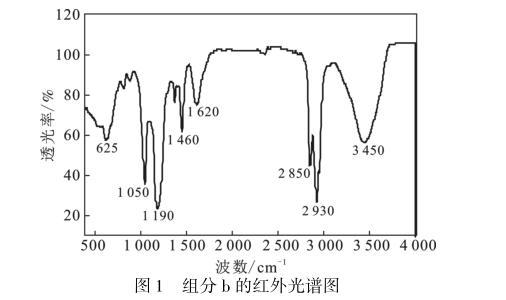 1.2.3石油磺酸鹽活性物的極性分離固定相硅膠在120℃活化6 h。層析柱(內(nèi)徑25 mm,長200 mm)填充硅膠高度為100 mm。活性物上柱,用洗脫劑進行洗脫。洗脫順序:CCl4→正丁醇→乙醇→去離子水,依次洗脫得到組分a、b、c、d。