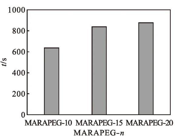 馬來酰蓖麻油酸聚乙二醇(n=10、15、20)酯的潤濕性能如圖5所示。由圖5可知:產品的潤濕時間隨著聚乙二醇聚合度的增大而增長。氧乙基數增加,其親水性增強,降低表面張力的能力減弱,潤濕性能減弱。