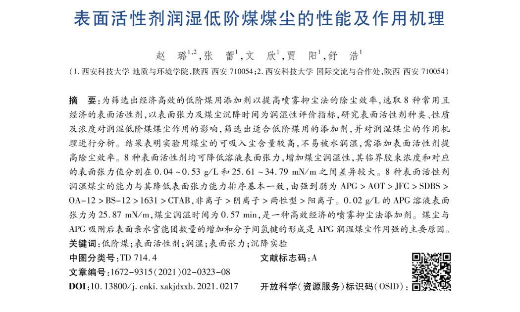 低階煤在中國(guó)儲(chǔ)量豐富且富含高附加值油氣資源,可以高效分質(zhì)利用,為緩解我國(guó)石油資源緊張和環(huán)境污染局面提供了新的可能,逐漸成為新的關(guān)注點(diǎn)。近年來(lái)隨著低階煤開(kāi)采量的增大,采煤機(jī)械化程度的提高,全機(jī)械化工作面上的煤塵濃度可達(dá)3 000 mg/m3,遠(yuǎn)超國(guó)家職業(yè)衛(wèi)生標(biāo)準(zhǔn)中的要求。長(zhǎng)時(shí)間暴露于超標(biāo)的煤塵環(huán)境是礦工患?jí)m肺病的重要誘因之一。塵肺病發(fā)病率高且無(wú)法治愈,2018年,全國(guó)報(bào)告的職業(yè)性塵肺病19 468例,占到了各類職業(yè)病新病例總數(shù)的8285%,且發(fā)生率還有上升趨勢(shì)。此外,井下煤塵濃度聚集到一定程度還會(huì)引發(fā)爆炸,造成更大的人員傷亡和經(jīng)濟(jì)損失。因此,有效抑制礦塵對(duì)煤礦安全生產(chǎn)和礦工的職業(yè)健康安全都至關(guān)重要。目前常用的措施包括通風(fēng)除塵、煤層注水、噴霧灑水等,這些技術(shù)對(duì)降低作業(yè)點(diǎn)的粉塵濃度都起到了重要作用。低階煤的煤化程度較低、揮發(fā)分及灰分含量高、含水率高、含氧多、孔結(jié)構(gòu)豐富,與其他煤種相比通常更易被潤(rùn)濕,因此適用噴霧抑塵。噴灑自來(lái)水的除塵效率只有不到60%,向水中加入表面活性劑可以增加煤塵潤(rùn)濕性和滲透性,提高除塵效率?;瘜W(xué)表面活性劑的選擇受自身性質(zhì)、結(jié)構(gòu)、煤塵表面官能團(tuán)、煤塵帶電性質(zhì)等多種因素的影響,其選擇具有特異性和專一性,目前關(guān)于抑制低階煤煤塵添加劑的研究還較少。篩選出常用且經(jīng)濟(jì)的表面活性劑作為添加劑提高低階煤煤塵的除塵效率具有積極意義。