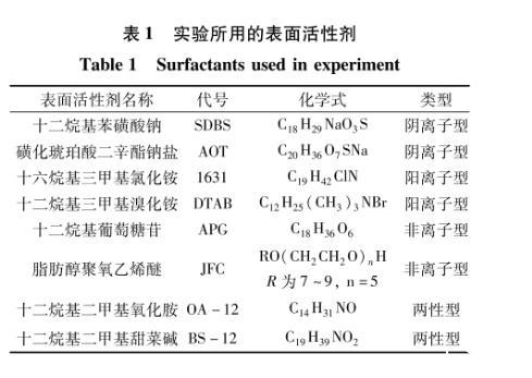 在查閱文獻(xiàn)的基礎(chǔ)上初選了8種常用且經(jīng)濟(jì)的表面活性劑(表1)。