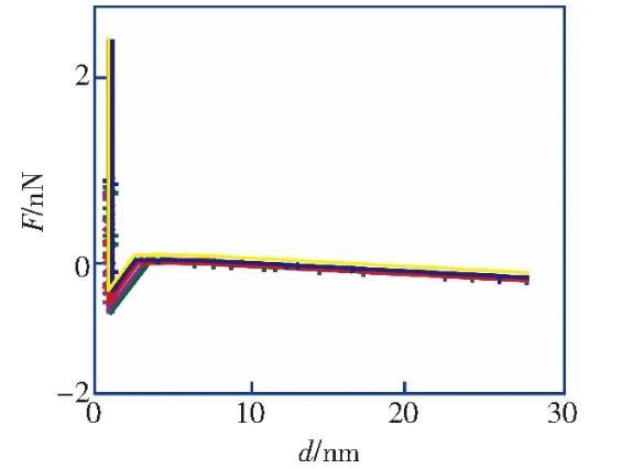 納米氣泡的高度在8~20 nm范圍之內,直徑在100~500 nm范圍之內,圖3c為圖3b中典型納米氣泡的截面圖。掃描得到納米氣泡圖像以后,在該表面上進行力曲線測量實驗,如圖2b所示。所有離曲線的‘跳進’距離均大于10 nm且是變化的,同時,由雙電層引起的斥力也消失了,不符合DLVO理論。這種‘跳進’距離不同的長程力應該是因為醇-水替換后HOPG表面上生成的納米氣泡造成的。圖3b中納米氣泡的覆蓋率約為21.8%,在該表面不同位置測量得到的力曲線必然會存在探針-HOPG相互作用的情況,即不都是探針-氣泡的相互作用的情況。然而,根據醇-水替換前后多次測量力曲線得到“跳進”距離d的統計分析(圖4a和圖4b),醇-水替換前測量得到的力曲線的“跳進”距離大部分都小于5 nm(99%),而醇-水替換后測得的力曲線的“跳進”距離均大于10 nm。這表明,醇-水替換后即使不是探針-氣泡相互作用的情況下,探針與HOPG表面的相互作用時仍然存在長程引力,而這應該是IGE造成的。該研究結果與Peng等人的研究結果一致,驗證了Limbeek對IGE與納米氣泡共存的假設。