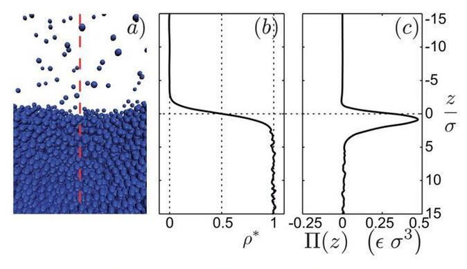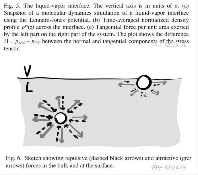 當分子間距較小時,斥力為主,分子間距較大時,引力為主。在斥力與引力平衡時,Lennard-Jones勢能最小。現在,我們就可以來詳細地考慮液-氣界面了。圖5a是通過分子動力學仿真得出的液-氣界面照片,對應的時間平均密度分布圖是圖5b。從高密度的液體到低密度的氣體發生在一個幾個分子厚度的窄區域。為了確定毛細力,我們沿垂直界面方向將系統分為兩個子系統(圖5a)??紤]左邊子系統對右邊子系統的單位面積的作用力,即應力,在豎直方向上的分布。這個力有兩個來源:壓力P和額外壓力Π(圖5c)。圖5c表明有個力局部存在于界面附近,其實這個力就是表面張力,且這個力范圍和密度突變的范圍很相似。這說明表面張力的確是一個真實的力,而不僅僅是表面能的一種純數學描述。既然我們發現在界面附近的確局部存在一個平行的力,那我們回到問題1,為什么表面張力平行于界面而不是垂直于界面?我們注意到圖1僅僅描繪了分子間引力作用。更全面的圖應該如圖6所示,包含了引力與斥力作用。在遠離界面的液體本體內,由于液體分子周圍的完全對稱性,分子的受力完全平衡。但是,靠近界面附近的地方,上下對稱性被打破。為修復豎直方向的力平衡,向上的斥力需平衡向下的引力。而在平行于界面的方向,對稱性仍然存在,平行于界面方向的力平衡仍然存在。這就可以存在一種情況,引力作用的強度與斥力作用的強度不同。實際上,在界面附近的水平方向上,引力作用比斥力更強,這產生了表面張力。