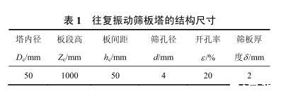 實驗是在內徑50 mm、有效高度1500 mm的往復篩板塔中進行,實驗設備流程圖見圖1。塔身為玻璃材質,塔頂和塔底有沉降段,篩板在塔頂的調速直流電機通過曲軸帶動篩板產生上下往復振動,振幅固定25 mm,振動頻率0~1.4 Hz。篩板材質為不銹鋼,不同于Karr振動篩板塔的大孔徑和高開孔率,本實驗采用的篩板孔徑和開孔率相對較小,振動萃取段為1000 mm。萃取塔的具體結構參數見表1。