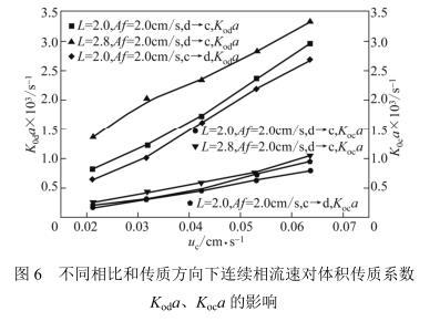 兩相流速、相比與傳質(zhì)方向?qū)w積傳質(zhì)系數(shù)的影響見圖6。圖中結(jié)果顯示:分別用有機相溶質(zhì)濃度和水相溶質(zhì)濃度表示傳質(zhì)推動力得到的體積傳質(zhì)系數(shù)Koda和Koca隨著連續(xù)相流速的增加而增大,傳質(zhì)方向相同(d→c)時,高相比的體積傳質(zhì)系數(shù)(Koda或Koca)大于低相比的體積傳質(zhì)系數(shù)。其原因主要還在于高流速和高相比的情況下,傳質(zhì)相界面積a更大。