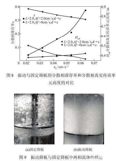 圖8給出了正丁醇-丁二酸-水體系分別在振動篩板塔與固定篩板塔中的分散相滯存率和分散相“真實”傳質(zhì)單元高度的對比。圖中顯示振動篩板塔中分散相滯存率x明顯高于固定篩板塔中的x,傳質(zhì)單元高度Hod遠低于固定篩板塔的Hod,而且振動篩板塔的x受連續(xù)相流速影響大,固定篩板塔的x受流速的影響微乎其微。這是由于兩種塔的萃取狀態(tài)不同(圖9),固定篩板塔的操作處于混合-澄清區(qū)[圖9(a)],振動篩板塔的操作處于分散區(qū)[圖9(b)]。