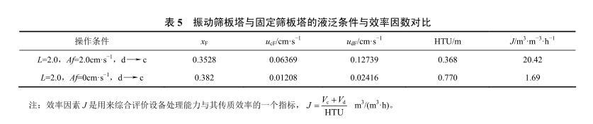 表5振動篩板塔與固定篩板塔的液泛條件與效率因數(shù)對比