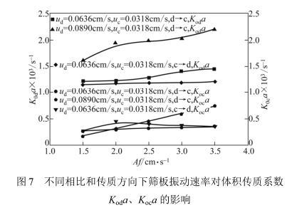 圖7不同相比和傳質(zhì)方向下篩板振動速率對體積傳質(zhì)系數(shù)Koda、Koca的影響