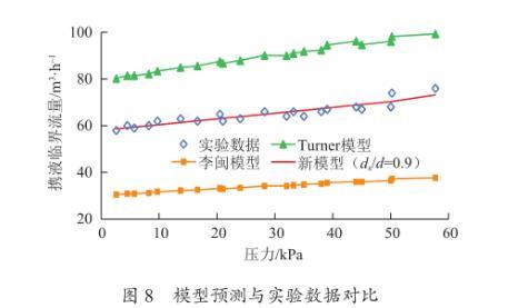 (3)液滴尺寸和變形對攜液臨界流量影響較大。當液滴特別小時,液滴在壓差下基本不發生形變,液滴基本呈球形,曳力系數近似0.44;隨著液滴直徑越大,液滴越容易變形,液滴高寬比越小,曳力系數越大,攜液臨界流速變小??紤]了液滴尺寸和液滴變形影響的新模型與實驗數據吻合良好。