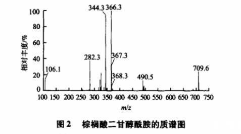 2.2.2質譜分析圖2為棕櫚酸二甘醇酰胺的質譜圖(正電荷模式)。