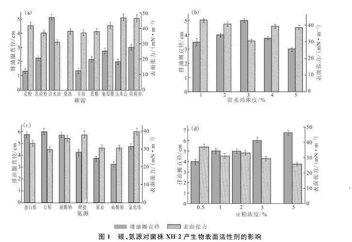2.1不同碳、氮源對菌株XH-2產(chǎn)生物表面活性劑的影響(圖1)