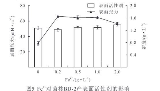 由圖5可知,當Fe2+濃度為0.2 g/L時,表面張力最大,可達66.4 mN/m,而表面活性劑量為1.22 g/L,當Fe2+濃度是CK時,表面張力最小,為30.9 mN/m,此時的表面活性劑量為1.27 g/L,而當Fe2+濃度為2 g/L時,表面活性劑量最大,為1.37 g/L,此時的表面張力為56.6 mN/m。分析可得,增加Fe2+后,菌株的表面張力明顯增加,表面活性劑量無顯著變化(P>0.05),Fe2+對菌株BD-2產表面活性劑無促進作用。