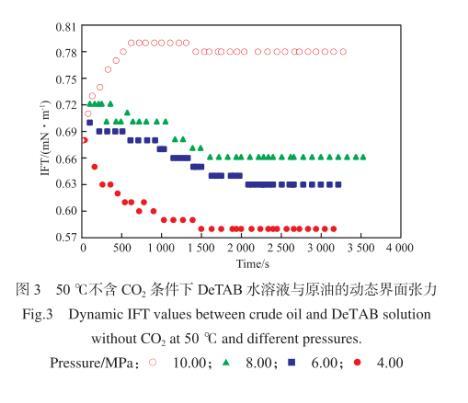 圖3為50℃、不含CO2條件下,DeTAB水溶液與原油的動態(tài)界面張力。由圖3可知,在DeTAB水溶液/原油體系中,油水兩相界面張力在初始階段有較大的變化,在接近平衡界面張力時,變化幅度趨于平緩,油水兩相界面張力穩(wěn)定所需時間在1 500 s左右。