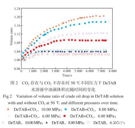 圖2為50℃下,CO2存在與CO2不存在時,DeTAB水溶液/原油體系中,油滴的體積與初始體積比隨時間的變化。由圖2可知,對于原油/CO2/DeTAB水溶液體系,在初始階段,油滴體積增加較快,在油滴體積增加到平衡值附近后,體積增加變緩慢。油滴體積達到穩(wěn)定所需時間在3 500~6 500 s范圍內。同時,隨著壓力的升高,油滴的平衡體積與初始體積比逐漸增大,這與原油體積膨脹系數(shù)隨著CO2壓力增大而增大相吻合。不含CO2的DeTAB水溶液/原油體系中,油滴體積達到平衡值所需時間在1 300 s左右,遠小于CO2存在時達到平衡狀態(tài)所需的時間;同時,油滴體積的增加幅度明顯低于CO2存在時的情況。CO2存在時,DeTAB水溶液/原油體系中,油滴體積的明顯增大,說明水中溶解的CO2可以有效地擴散進入油相中,實現(xiàn)其對原油的溶脹效果,這將利于將油藏孔隙中的一部分殘余油排出,從而提高油田采收率。