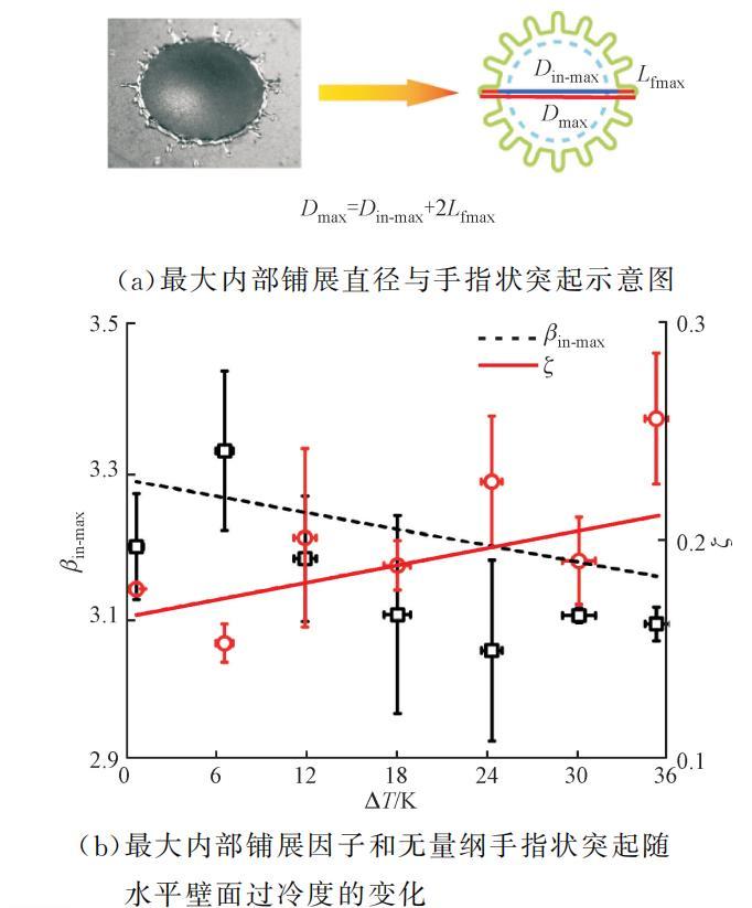 為了揭示βmax隨水平壁面過冷度的這一非單調(diào)變化,將βmax分為兩部分,并分別研究各部分與乙醇濃度的關(guān)系。如圖7(a)所示,βmax包含內(nèi)部鋪展無量綱直徑βin-max=Din-max/D0,以及邊緣的無量綱指狀長度ζ=LfmaxD0,其中Din-max為液滴鋪展到最大程度的內(nèi)部鋪展直徑,Lfmax為液滴鋪展至最大的指狀長度。當(dāng)ζ<0.15時,認(rèn)為液滴不形成指狀突起,當(dāng)ζ≥0.15時,認(rèn)為液滴形成指狀突起。