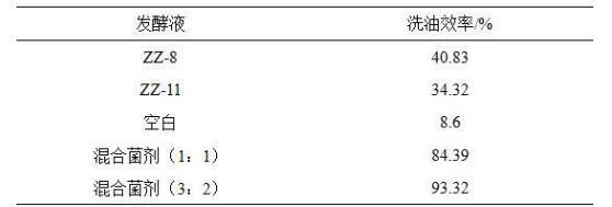 各組洗油效率測試結(jié)果如表3所示,解淀粉芽孢桿菌(Bacillusamyloliquefaciens)ZZ-11和膠凍樣芽孢桿菌(Bacillus mucilaginosus)ZZ-8發(fā)酵液均具有優(yōu)秀的洗油效率,本發(fā)明混合菌劑的洗油效率更為優(yōu)異,分別達(dá)到84.39%和93.32。