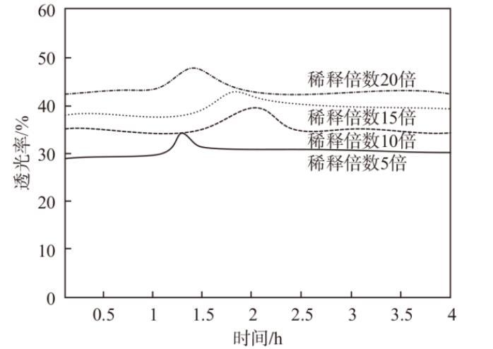 透光率測試結果如圖5所示。由圖5可知,氨基改性硅油柔軟劑稀釋倍數與透光率之間呈正比,這是因為水分子的增加使得柔軟劑中氨基硅油分子之間的縫隙越大,增加透光率;隨著時間的延長,透光率前期存在小幅度的提高和下降過程,但最終也基本維持在一定水平上,證明透光率的穩定性。