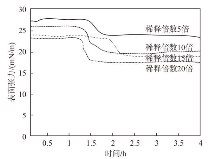 表面張力測試結果如圖4所示。由圖4可知,隨著稀釋倍數提高,氨基改性硅油柔軟劑的表面張力越來越小;隨著時間的延長,雖然氨基改性硅油柔軟劑的表面張力出現下降波動的情況,但最終基本維持在一定的水平上,波動幅度不大,說明表面張力穩定性較好,并不會受到稀釋程度較大的影響。