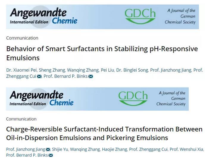 近期,江南大學(xué)蔣建中-崔正剛科研團隊在新型智能表面活性劑設(shè)計開發(fā)領(lǐng)域取得突破性研究進展,連續(xù)在Angew.Chem.Int.Ed.上發(fā)表2篇研究論文:“Behavior of smart surfactants in stabilizing pH-responsive emulsions,Angew.Chem.Int.Ed.2021,60,5235-5239(通訊作者崔正剛教授和B.P.Binks教授)”和“Charge-reversible surfactant-induced transformation between oil-in-dispersion emulsions and Pickering emulsions,Angew.Chem.Int.Ed.2021,60,11793-11798(通訊作者蔣建中教授和B.P.Binks教授)”。