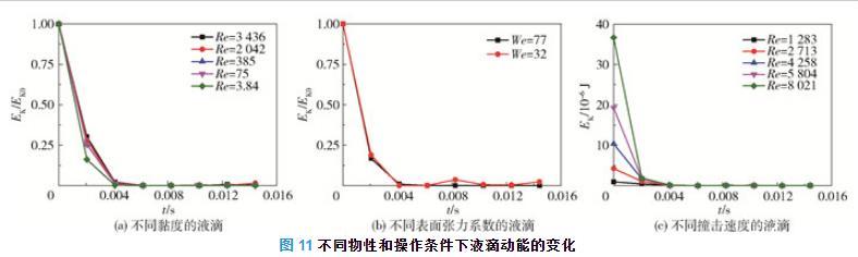 圖11(b)為水和乙醇液滴在撞擊過程中動能隨時間的變化。可以看出,液滴在鋪展過程中動能的減小量和減小的速率不隨表面張力系數而變化。