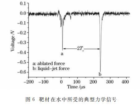 若空泡在固壁面附近潰滅,泡表面的壓力梯度會形成指向靶材的高速液體射流。圖6為由探測裝置圖2(b)獲得的對應(yīng)單脈沖能量為34mJ時,銅片在激光作用全過程中所受的典型力學(xué)信號。圖中可以明顯看到兩個峰的存在,峰a為激光等離子體產(chǎn)生的燒蝕壓力脈沖信號,峰b為射流沖擊力信號。從圖6可以看出,該激光能量作用下,射流沖擊力的強(qiáng)度遠(yuǎn)大于等離子體燒蝕力。
