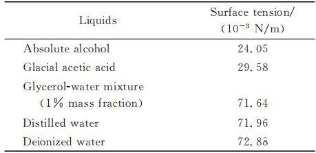 由于本文研究液體張力變化對固壁面近旁空泡生長和潰滅過程的影響,因此所用液體的粘滯系數(shù)μ及密度ρ應(yīng)大體相近,在空氣中的表面張力應(yīng)有較大差異。實驗采用5種液體,其表面張力如表1所示。