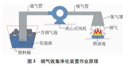 煙氣收集凈化裝置主要由置液桶、通氣管、離心式風機、吸氣管、集氣罩和燃油池等組成,其凈煙工作原理如圖3所示。風機抽走集氣罩下燃油池中汽油燃燒的黑煙,將其通入桶內(nèi)發(fā)泡液中;氣體進入液體后會立刻浮出液面,在液體表面張力作用下排出液面的煙氣被液膜包裹成含煙氣泡;隨著煙氣不斷被通入發(fā)泡液中,含煙泡泡很快就溢滿整個置液桶。實驗前測量并記錄水及發(fā)泡液的pH值。