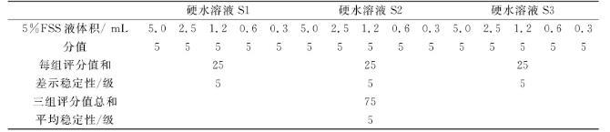 由表3知,FSS在硬水中的評分總和為75,可得出氟硅表面活性劑FSS的平均穩定性為5級,另外,FSS在硬水中的每組評分值和均為25,從差示穩定性評分標準可知,FSS的差示穩定性也為5級。綜合評定分析表明:FSS在硬水中的穩定性很好。