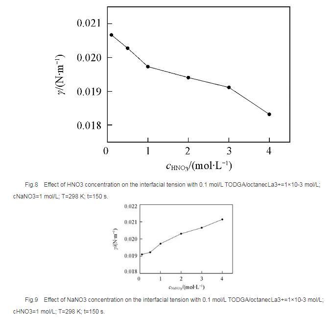 以電解質(zhì)NaNO3作為離子強度變量,考察了NaNO3濃度變化對界面張力的影響。結(jié)果(圖9)表明,界面張力隨著NaNO3濃度的升高而增大,這是由于隨著NaNO3濃度的升高, TODGA在界面上聚集的穩(wěn)定性降低,降低了其溶解性,增大了界面張力;同時會增強對金屬離子的萃取能力,減少界面上游離的萃取劑分子數(shù),使界面張力增大。