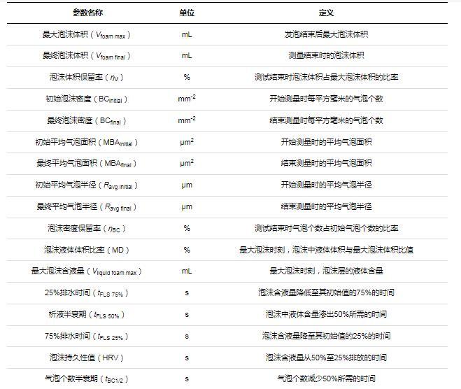 通過DFA100動態(tài)泡沫分析儀產(chǎn)生泡沫并檢測其泡沫性能。裝樣容器由一個玻璃圓筒組成,圓筒底部的固定攪拌槳可設(shè)定攪拌條件。將50 mL的表面活性劑待測液加入上述玻璃圓筒中,設(shè)定好測試程序,攪拌速度4 000 r/min,攪拌時間120 s,泡沫產(chǎn)生后系統(tǒng)檢測運行10 min。每次運行后,用蒸餾水清洗玻璃圓筒和攪拌槳。所有泡沫實驗均為3次重復(fù)。通過DFA100內(nèi)置軟件對泡沫體積、泡沫密度、泡沫穩(wěn)定性等進(jìn)行分析,主要測試參數(shù)及其定義如表1所示。