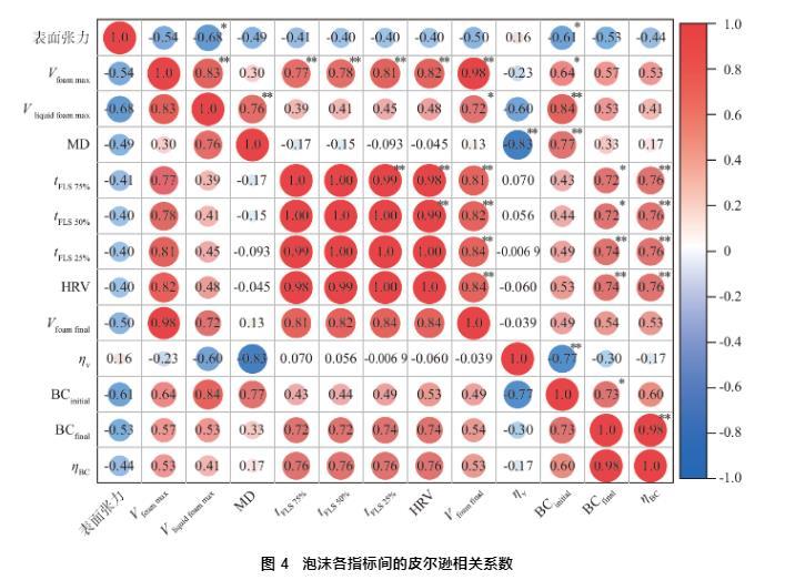 圖4泡沫各指標間的皮爾遜相關(guān)系數(shù)