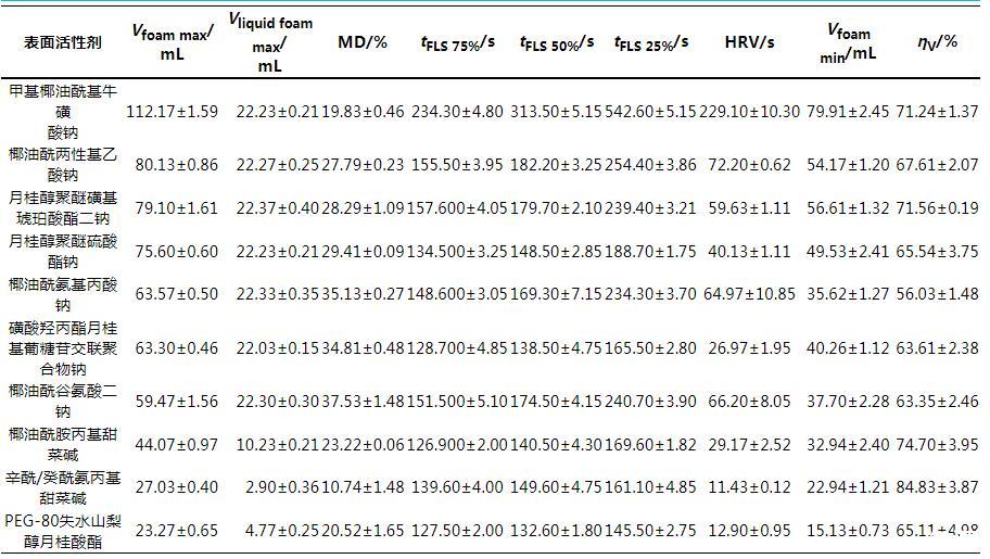表4不同表面活性劑的泡沫體積、體積保留率、含液量等指標結(jié)果