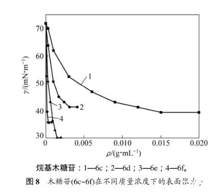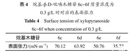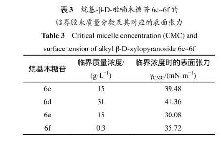 表3所示為烷基-β-D-吡喃木糖苷6c~6f的臨界質量分數(shù)及所對應的表面張力。溶液表面的吸附量達到飽和時(剛好飽和時的濃度即為臨界濃度),表面張力最小。從表3可以看出:辛基-β-D-吡喃木糖苷(6e)達到臨界濃度時對應的表面張力是最低的,能力最強。因為烷基木糖苷的表面活性是由其親水糖基和疏水烷基鏈共同決定,當烷基鏈長為=8(糖苷6e)時,親水性和疏水性達到最佳平衡,表面張力最低。