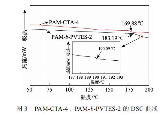 圖3為PAM-CTA-4、PAM-b-PVTES-2的DSC曲線。從圖3可以看出,PAM-CTA-4只有一個玻璃化轉變溫度(Tg),為169.88℃,但是PAM-b-PVTES-2有兩個Tg,分別為183.19和190.09℃,分別對應了聚丙烯酰胺(PAM)和聚乙烯基三乙氧基硅烷(PVTES)的Tg。PAM和PVTES鏈段間存在一定的相互作用,這些相互作用導致嵌段共聚物中兩相的Tg與各自均聚物的Tg不同,兩相的相互作用(融合)導致Tg向兩者之間移動。由此可知,合成的聚合物具有兩相結構,屬于嵌段共聚物。