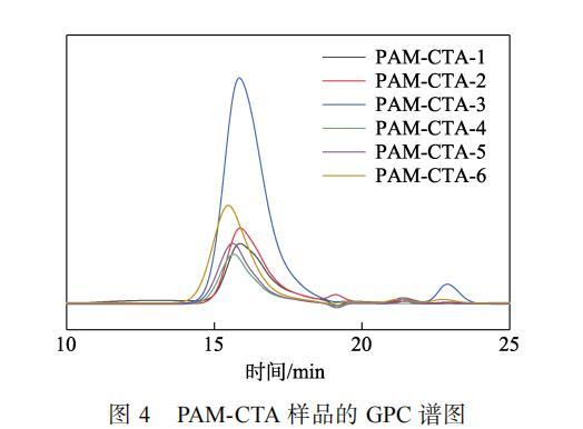 從表1可知,隨著DBTTC用量的降低,共聚物相對分子質量逐漸增加,重均相對分子質量(Mw)由5755增加到10505。這是因為,隨著鏈轉移劑DBTTC用量的增加,反應體系中DBTTC的濃度增加,鏈增長自由基與鏈轉移劑DBTTC反應生成休眠中間體,鏈增長停止,PAM-CTA的相對分子質量隨著鏈轉移劑用量的增加而降低,實現對PAM-CTA相對分子質量的可控合成。由于PAM-CTA-4的分子量分布最窄,因此,選擇PAM-CTA-4進行下一步反應。