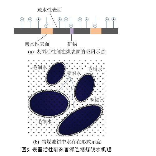 表面活性劑在煤表面的吸附可由圖5a解釋,親水基團主要與煤表面礦物質或煤親水性表面發生吸附,疏水基團主要與煤表面疏水位點發生吸附。由于本次研究煤樣為煉焦煤精煤,其表面以疏水為主,這導致大部分表面活性劑的疏水基團與煤表面疏水區域發生吸附,使得表面活性劑親水基團暴露在外,因此煤表面親水性增加。煤表面親水性增加雖然會使煤表面水化膜變厚,吸附水能力增加,但該作用與表面活性劑促進毛細水的脫出效應相比較小(圖5b)。因此,表面活性劑的存在雖使煤表面親水性上升,但使水的表面張力大幅降低,從而使煤粒間隙中的毛細水更容易在壓力的作用下排出,因此表面活性劑在此研究中降低了精煤濾餅中的水分。