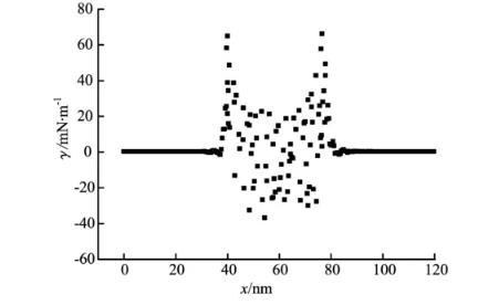 模擬水分子數(shù)N1=3 000,十二烷基硫酸鈉數(shù)N2=20,溫度T=300 K,水—表面活性劑體系的局部界面張力見(jiàn)圖10。由圖10可知,從汽相主體向液相過(guò)渡過(guò)程中,界面張力值逐漸增加,在氣—液界面區(qū)達(dá)到峰值;在液相主體又在零值附近波動(dòng)。