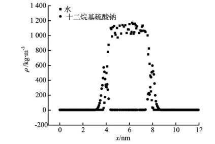 向純水中加入十二烷基硫酸鈉表面活性劑,水分子3 000個(gè),十二烷基硫酸鈉20個(gè),模擬得到300 K下水—表面活性劑體系的密度分布,如圖8所示。由圖8可見(jiàn),對(duì)于只有水的體系來(lái)說(shuō),其密度變化基本是符合由汽相到液相逐漸增加的趨勢(shì),而對(duì)于加入的表面活性劑十二烷基硫酸鈉的體系來(lái)說(shuō),其密度的變化情況與只有水的體系有明顯的不同。從圖8可以看出,在氣—液兩相的過(guò)渡區(qū)域,加表面活性劑的體系密度出現(xiàn)明顯的增長(zhǎng)。