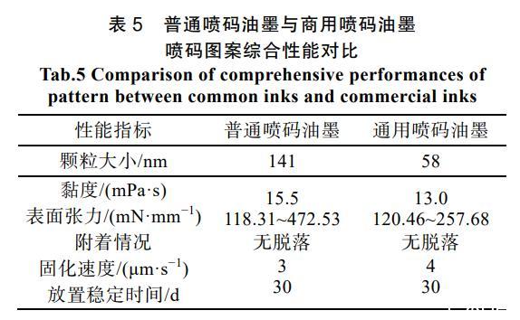 進(jìn)一步對(duì)2種油墨的噴碼及圖案綜合性能對(duì)比,結(jié)果如表5所示。可以看到:在固體顆粒大小以及流體黏度上,本通用油墨具有顯著優(yōu)勢(shì);在2種承印紙張上分別進(jìn)行噴碼,本通用油墨具有更小及更窄的表面張力分布。隨后使用3M長(zhǎng)膠帶對(duì)噴碼圖案表面進(jìn)行反復(fù)黏接,2種噴碼油墨的圖案均無墨跡脫落,體現(xiàn)出優(yōu)秀的附著力。最后,將圖案樣品均放置30 d,所有噴碼圖案均未出現(xiàn)形變、褪色和毛邊,證明具有良好的穩(wěn)定性。