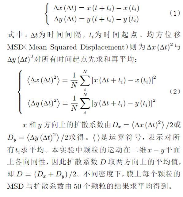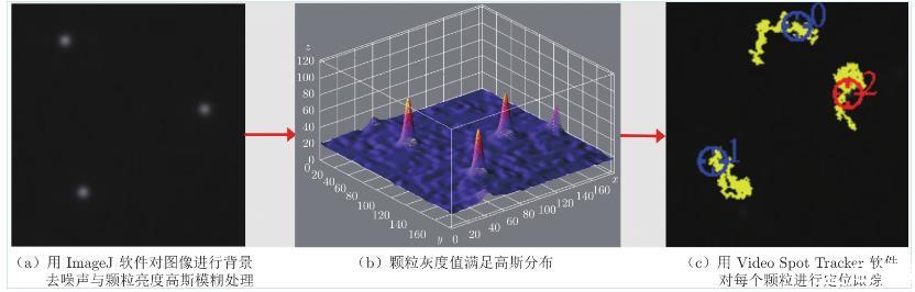 實驗采用Olympus顯微鏡(配備60倍物鏡)觀察顆粒在膜上的布朗運動,同時利用電子增益高速攝像機(Andor 897 EMCCD)進行拍攝。每個視頻拍攝時間為200 s,幀頻為0.05 s,曝光時間5 ms,圖像尺寸為300像素×300像素,分辨率為0.26μm/m。采集原始圖像中的顆粒灰度值不符合標準高斯分布,因此使用圖像處理軟件ImageJ對圖像進行背景去噪聲(Background Subtraction)和高斯模糊(Gauss-ian Blur)處理(圖3(a)),使顆粒灰度值達到標準高斯分布(圖3(b))。之后用Video Spot Tracker軟件定位每個顆粒的灰度峰值(圖3(c)),即顆粒質心,定位誤差僅為0.5像素,進而對顆粒二維運動軌跡(平面)進行實時跟蹤。軟件自動將顆粒在每一時刻的像素位置坐標存入計算機中,使用MATLAB計算顆粒在不同時間間隔Δt內沿和方向的位移,計算公式如下: