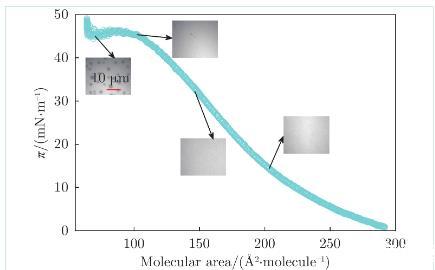 圖2為膜表面壓強隨膜密度的變化曲線,(以DPPC磷脂分子所占平均面積作為衡量膜密度的物理量)。在顯微鏡下觀察了膜在不同密度下的形貌(圖2中4張照片)。膜被壓縮到100?2/molecule之前,處于液態擴張(Liquid Expanded,LE)相,磷脂分子排列較松散,膜表面結構均勻。當膜被壓縮到60~100?2/molecule時,膜上開始出現直徑為幾微米的磷脂凝聚(Tilted Condensed,TC)相(照片中斑點),TC區域內磷脂分子的排列比LE區域更緊密。熒光劑Texas red DHPE傾向于分布在LE區域,因此LE區域顯示為淺色,TC區域顯示為深色。膜繼續被壓縮,在LE?TC共存相階段,膜表面壓強恒定在45 mM/m左右,TC區域數量和面積占比增大。當膜被進一步壓縮(<60?2/molecule),此時膜表面幾乎被TC區域占據,TC區域相互擠壓,導致膜表面壓強直線上升,LE區域僅存在于TC區域之間的空隙。