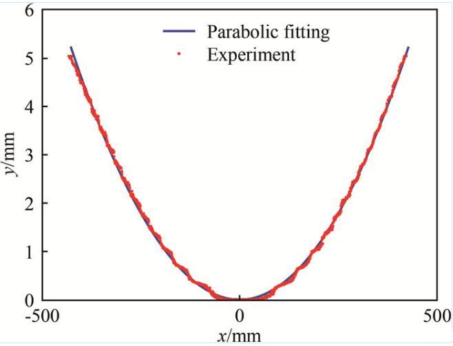 為驗(yàn)證曲線方程(10),在砝碼質(zhì)量m=0.2 kg、皂液流量Q=35 mL/min時(shí),實(shí)測了穩(wěn)態(tài)流動(dòng)皂膜狀態(tài)下尼龍繩的位置坐標(biāo),如圖2中的離散點(diǎn)所示。尼龍繩位置通過照相得到,為獲得較大范圍內(nèi)的圖像,采用的放大倍數(shù)為1個(gè)像素對(duì)應(yīng)0.35 mm的物理尺寸。對(duì)尼龍繩圖像在水平方向的光強(qiáng)分布進(jìn)行高斯函數(shù)擬合以獲得亞像素的定位精度。圖2中的光滑曲線是采用式(10)進(jìn)行擬合的結(jié)果,與實(shí)測曲線吻合良好,驗(yàn)證了分析的正確性。利用已知的砝碼質(zhì)量,可以進(jìn)一步得到表面張力系數(shù)γ=27.5 mN/m。值得注意的是:當(dāng)砝碼質(zhì)量很小時(shí),表面張力引起的流道收縮很大(在中點(diǎn)O處達(dá)到最大值12%),為避免由此帶來的流速和厚度場改變,在流動(dòng)皂膜實(shí)驗(yàn)中一般使用m=2 kg的砝碼。