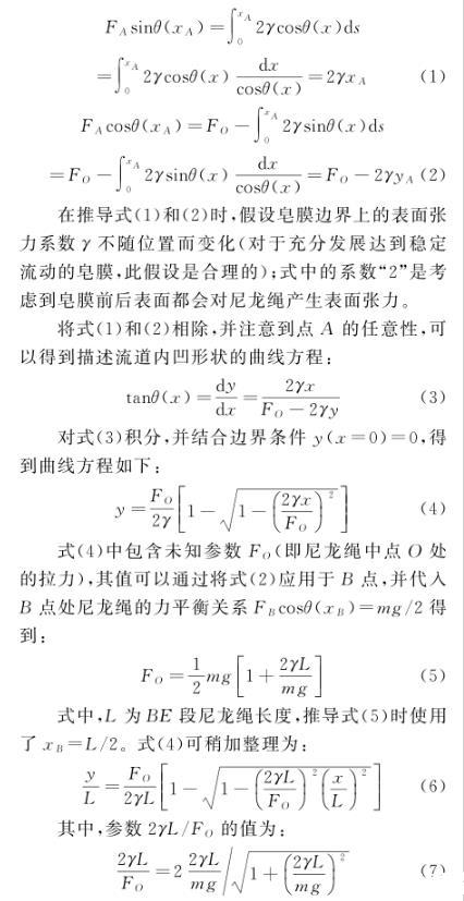 在推導(dǎo)式(1)和(2)時(shí),假設(shè)皂膜邊界上的表面張力系數(shù)γ不隨位置而變化(對(duì)于充分發(fā)展達(dá)到穩(wěn)定流動(dòng)的皂膜,此假設(shè)是合理的);式中的系數(shù)“2”是考慮到皂膜前后表面都會(huì)對(duì)尼龍繩產(chǎn)生表面張力。